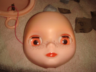 Esta tarde he "mateado" a la Cabezona ( me gusta más así k no engendrix como les llaman algun@s por el foro de VDP ) k me he kedado para mí ;) La experiencia ha sido muy diverdida...Primero he hecho una prueba con la parte de atrás como se ve en la primera foto, he usado sólo una lija de 1200: son baratas ( una tamaño din-4 me costó sólo 0.65 en una tienda de manualidades y lienzos ) Se corta la lija en cuadros pequeños y se va lijando haciendo circulos...en un momento se matea y keda el plástico bastante suave...va soltando la lija un polvo por eso tenía a mano una toalla y la iba pasando por la cara de la muñeca...Los párpados no se notan en las fotos pero tb los he pintado en color rosado...Las pecas se las he pintado con una pintura al óleo marrón usando un palillo y la boca con pintalabios...el resultado de la boca no me acaba de convencer, así k otro día, con paciencia, volveré a probar ;)